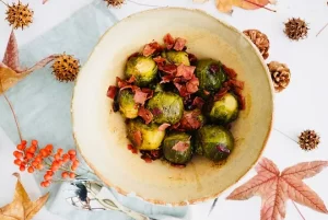 Repollitos bruselas con tocino de pavo crocante y cranberries
