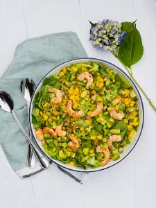 Ensalada de hojas verdes, camarones grillados, mango y palta